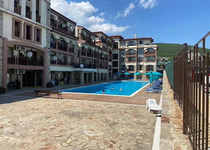 Apartament Panorama Bay 20 Fancy Studio Święty Włas o powierzchni 30 m^2 znajduje się w dzielnicy Jurta posiada odkryty basen. Park wodny Action jest 10 min samochodem od apartamentu.